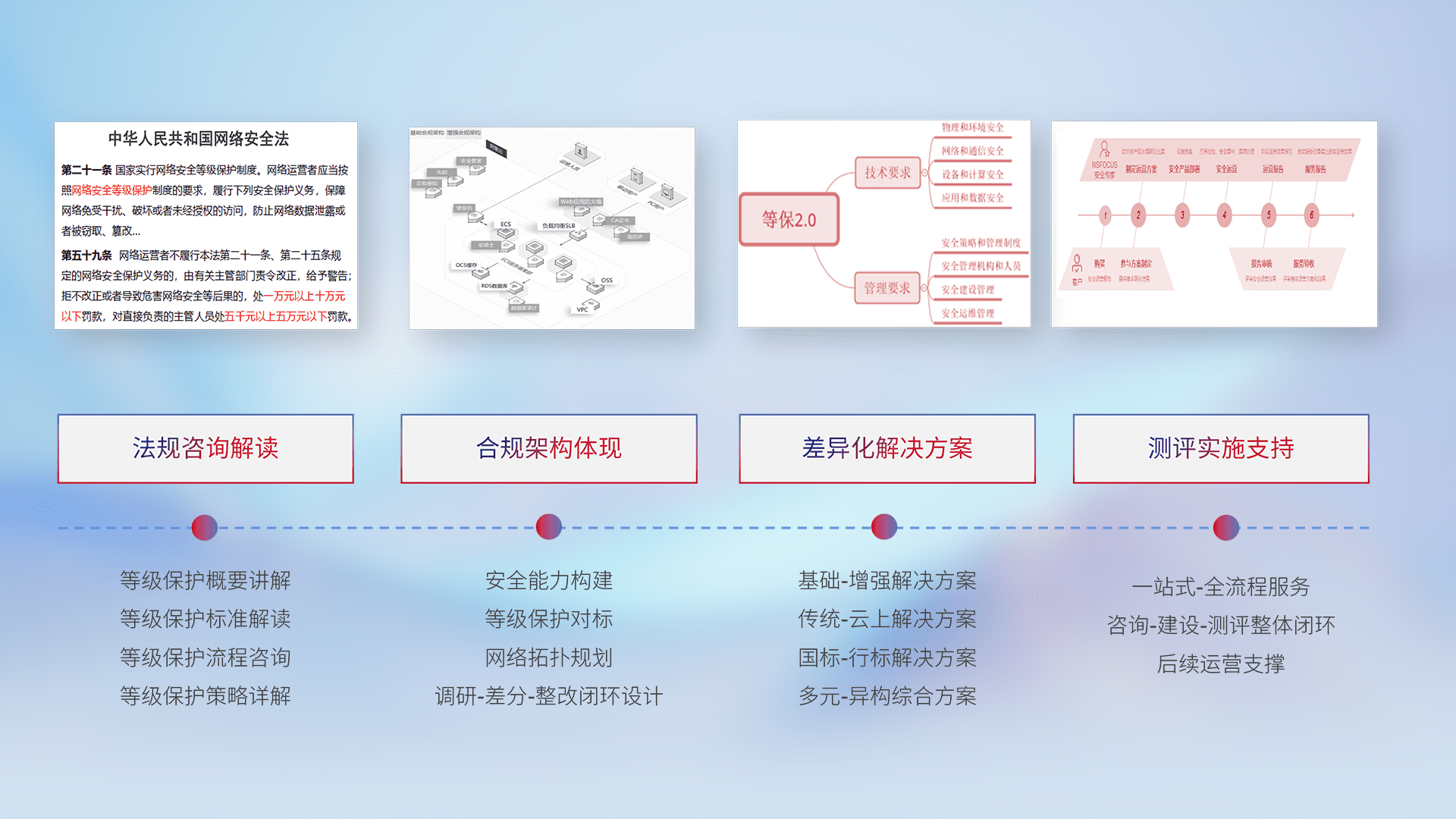 通过专业的法律咨询解读、、合规架构体现、、、差异化解决方案、、、、测试实施支持等服务,,,,为客户量身打造等保合规体系。。。。