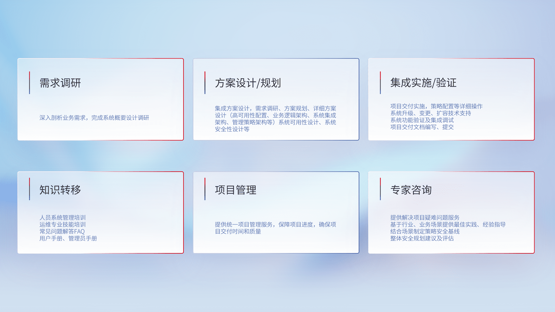 针对客户行业特性,,将宏观的安全战略和需求,,,通过专业的交付服务,,实现项目落地,,为客户提供标准规范的集成交付服务。。